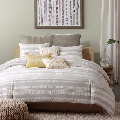 INK+IVY Lakeside is the perfect neutral collection for any room in your home. The light grey stripes are printed on 200 thread count cotton fabric with a seersucker finish adding value to your bedding. For a casual look for any room in your home, the INK+IVY Collection offers a unique comforter finishing technique that offers a clean, duvet-like finish with no bar tacks on the top of the comforter.