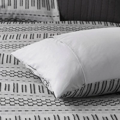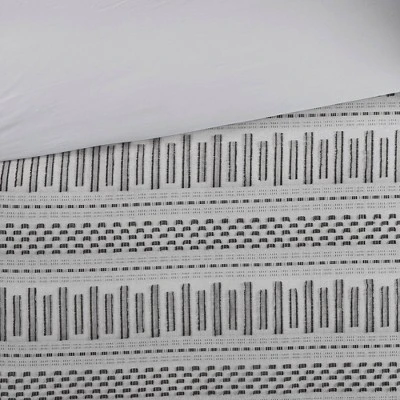 Give your bedroom a comfortable farmhouse look with Rhea Cotton Jacquard Duvet Cover Mini Set. The ivory cotton duvet cover features horizontal stripes, in charcoal hues, with eyelash-looking woven details that add a charming accent to the top of the bed. Matching shams mimic the design seen on top of the bed completing the cotton jacquard bedding set. Made from 100% cotton, this jacquard duvet cover set is machine washable for easy care and provides a causal allure for your bedroom dƩcor. A button closure allow you to place a comforter insert within the duvet cover and four inside ties on the corners help prevent it from shifting (Insert is NOT included). This bedding set is also OEKO-TEX certified, meaning it does not contain any harmful substances or chemicals, ensuring quality comfort and wellness. Items in the set may come in a rolled or compressed packaging, which will need to be fluffed up or steam ironed before use to remove wrinkles.