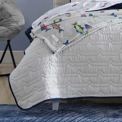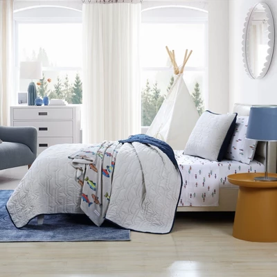 Eddie Bauer kids quilt collection is made for little adventurers to get their best nights sleep. Each quilt set is made from 100% polyester, making it lightweight, warm and easy care. Rounded corners, contrast binding and interesting quilt stitches make these quilt sets extra special. Perfect for a child’s bedroom, sleepovers, camping and more. Twin set measurements: quilt 86″l x 66″w, sham 20″l x 26″ w; full/queen measurements: quilt 86″l x 76″ w, sham 20″l x 26″w. Each set is cpsia tested, ensuring it is safe for children 12 and under. Easy care and machine washable. Complete the look with Eddie Bauer kids sheets, throws and blankets – sold separately