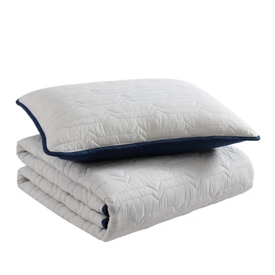 - Solid medium grey with unique quilt stitch, featuring a navy contrast binding; Reverses to a solid navy