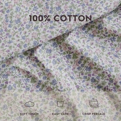 - Emogene percale pillowcase pair has a small scale floral print in shades of lavender.