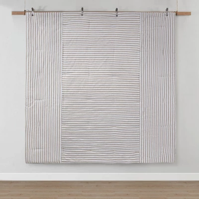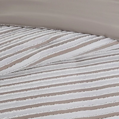 This Madison Park casual farmhouse style comforter set features a pieced clip jacquard pattern in a white and natural two-tone stripe effect. Two decorative pillows are included, featuring either the clip jacquard design or embroidery details to add a touch of elegance. This machine washable bedding set is OEKO-TEX certified and features an antimicrobial treatment.