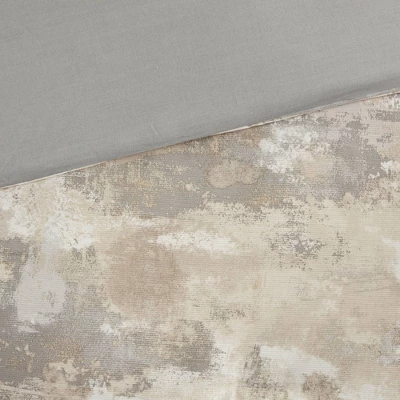 Modernize your bedroom decor with the chic styling of the Madison Park Mist 7 Piece Comforter Set. This luxurious comforter features an abstract print in various gray, taupe and cream color on the cotton-rich ottoman weave face with a solid grey reverse to create a glamorous look. The 2 matching shams mirror the abstract design of the comforter, while 3 coordinating decorative pillows with embroidered details add the finishing touches. A complementary solid grey bed skirt provides a clean finish to complete this modern comforter set. This bedding set is also OEKO-TEX certified, meaning it does not contain any harmful substances or chemicals to ensure quality comfort and wellness. Items in the set may come in a rolled or compressed packaging, which will need to be fluffed up or steam ironed before use to remove wrinkles.