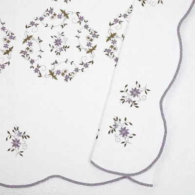 Bring home a taste of the country with the Gwen quilt set. Embroidered with wreaths of lavender flowers with green leaves on a white cotton face . The binding is made of a lavender floral fabric that adds a touch of pattern to the soft scalloped edge. Vermicelli quilting adds a subtle allover pattern. 100% cotton face and fill with a brushed polyester backing.