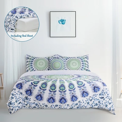 What is Bohemian Style?Bohemian style refers to a style of clothing that retains the characteristics of a certain nomadic people, which is characterized by bright handmade decorations and rough and heavy fabrics.Bohemian style represents an unprecedented romanticization, folklore, and liberalization. It also represents an artist temperament, a fashion trend, and an anti-traditional lifestyle. Features: 1.Unlike cheap polyester fabrics, we choose Polyester Microfiber , which is softer and not fade, and has a longer service life. 2.Address all your bedding needsโโ4/5 Piece bedding set include 1 duvet cover+1 fitted sheet+1/2 pillowcase+1 throw pillowcase. 3.Quilt Set are designed with zipper closure and concealed rope to keep the duvet fixed in place. 4.Color: Black, Purple, Navy Blue, White and Black, Red, Light Blue, White and GreenAbout Size(No Comforter & Pillow Insert Included) 1. TWIN SIZE–Duvet cover:90″x68″, Fitted Sheet:74″x38″(13″deep), Pillowcase: 20″x27″(1pc), Throw Pillow Case:18″x18″ 2. QUEEN SIZE–Duvet cover:90″x90″, Fitted Sheet:79″x60″(13″deep),Pillowcase:20″x 27″(2pc), Throw Pillow Case:18″x18″ 3. KING SIZE–Duvet cover:102″x90″,Fitted Sheet:79″x 77″(13″deep),Pillowcase:20″x 35″(2pc), Throw Pillow Case:18″x18″Nice tips: 1. To protect the sheet, please turn the inside out when you wash the bedding set. 2. Soaking time should not to be too long and tumble dry on low.