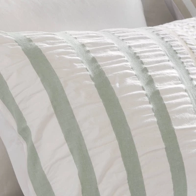 The Sutton Comforter Set shows off subtle stripes in khaki purple and green amidst a white seersucker background. The different stripe widths along with the color variations add dimension to this clean look. The INK+IVY Collection offers a unique comforter finishing technique that offers a clean, duvet-like finish with no bar tacks on the top of the comforter. Made from yard dyed, 100% cotton, this set includes a comforter and one sham. Items in the set may come in a rolled or compressed packaging, which will need to be fluffed up or steam ironed before use to remove wrinkles.
